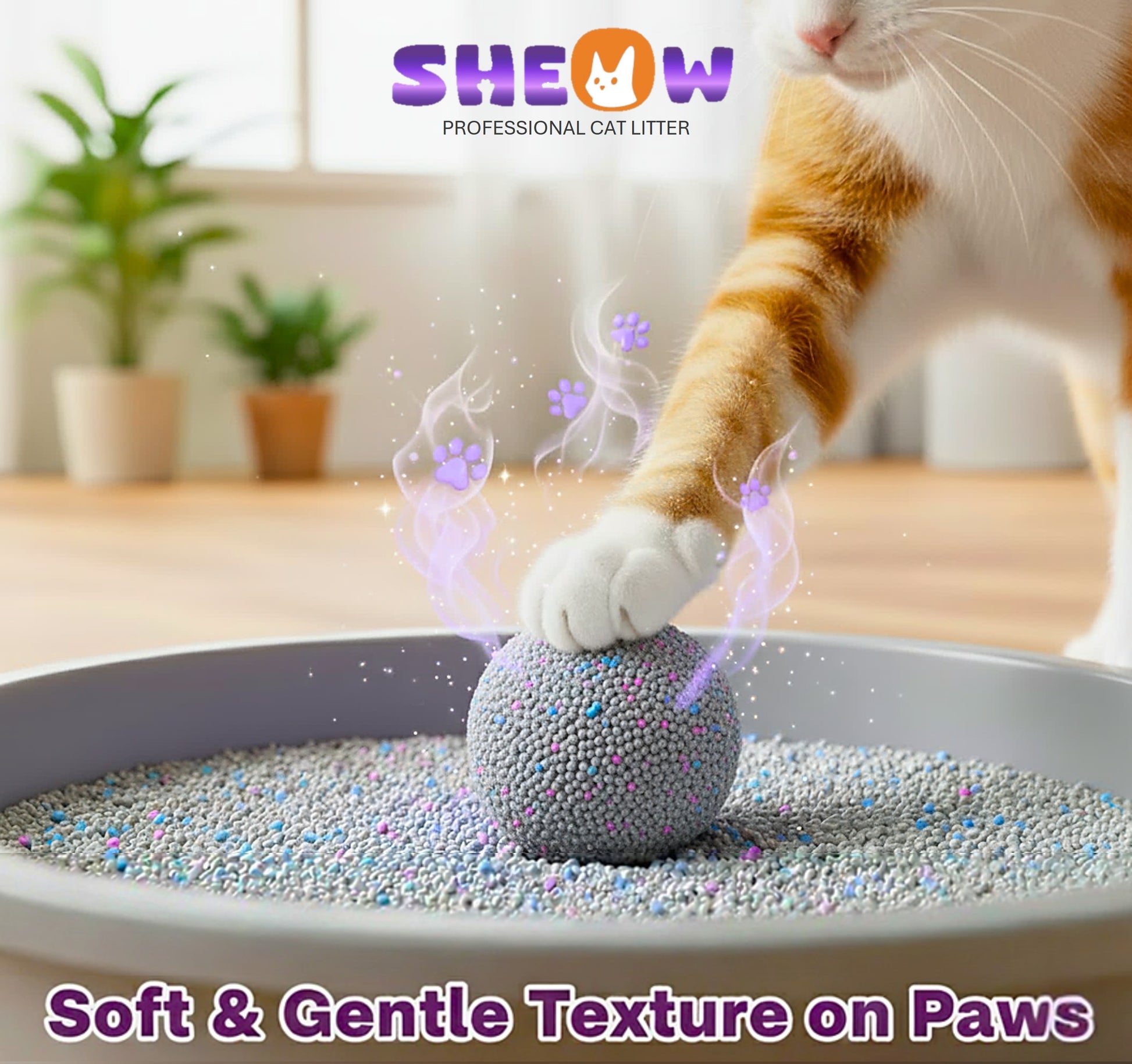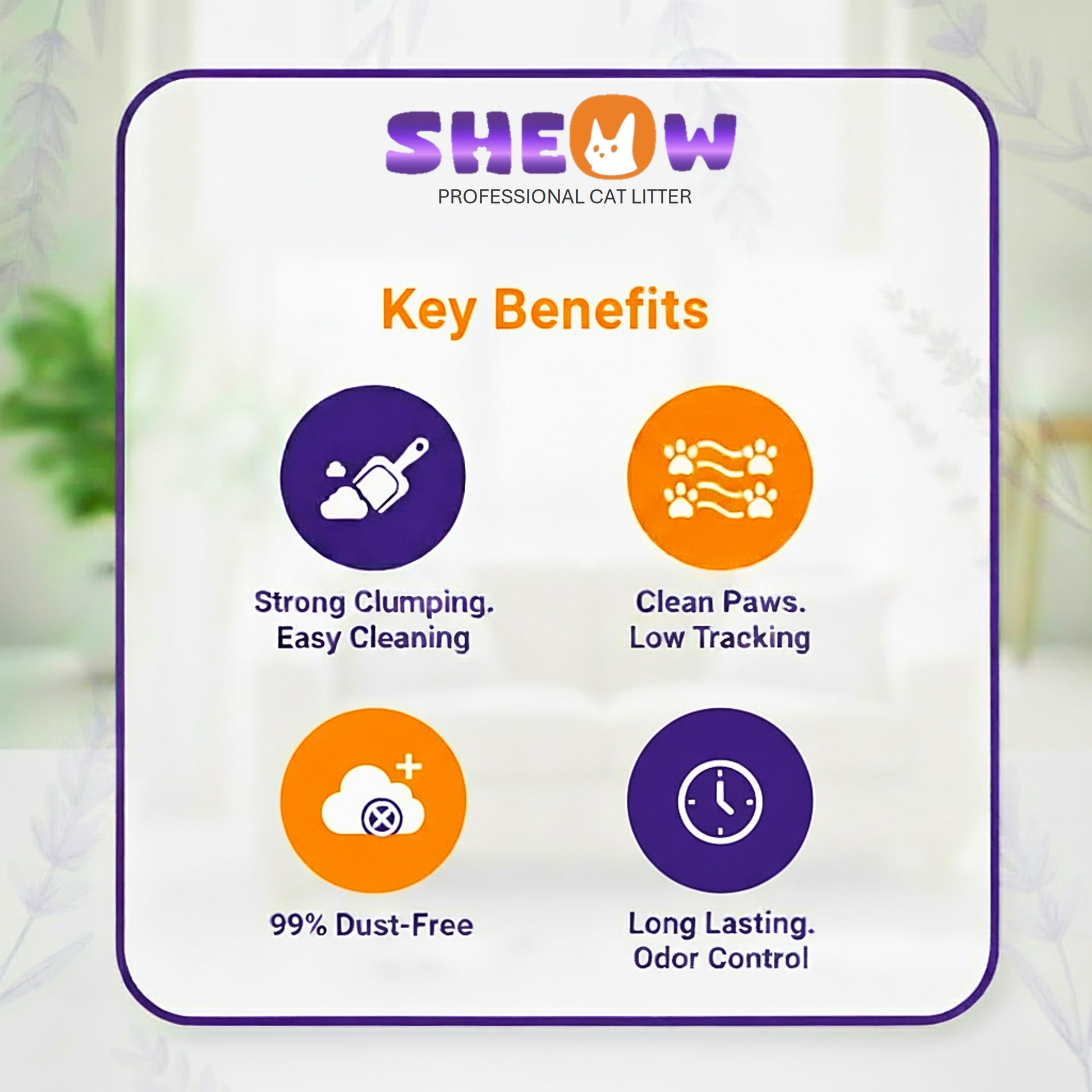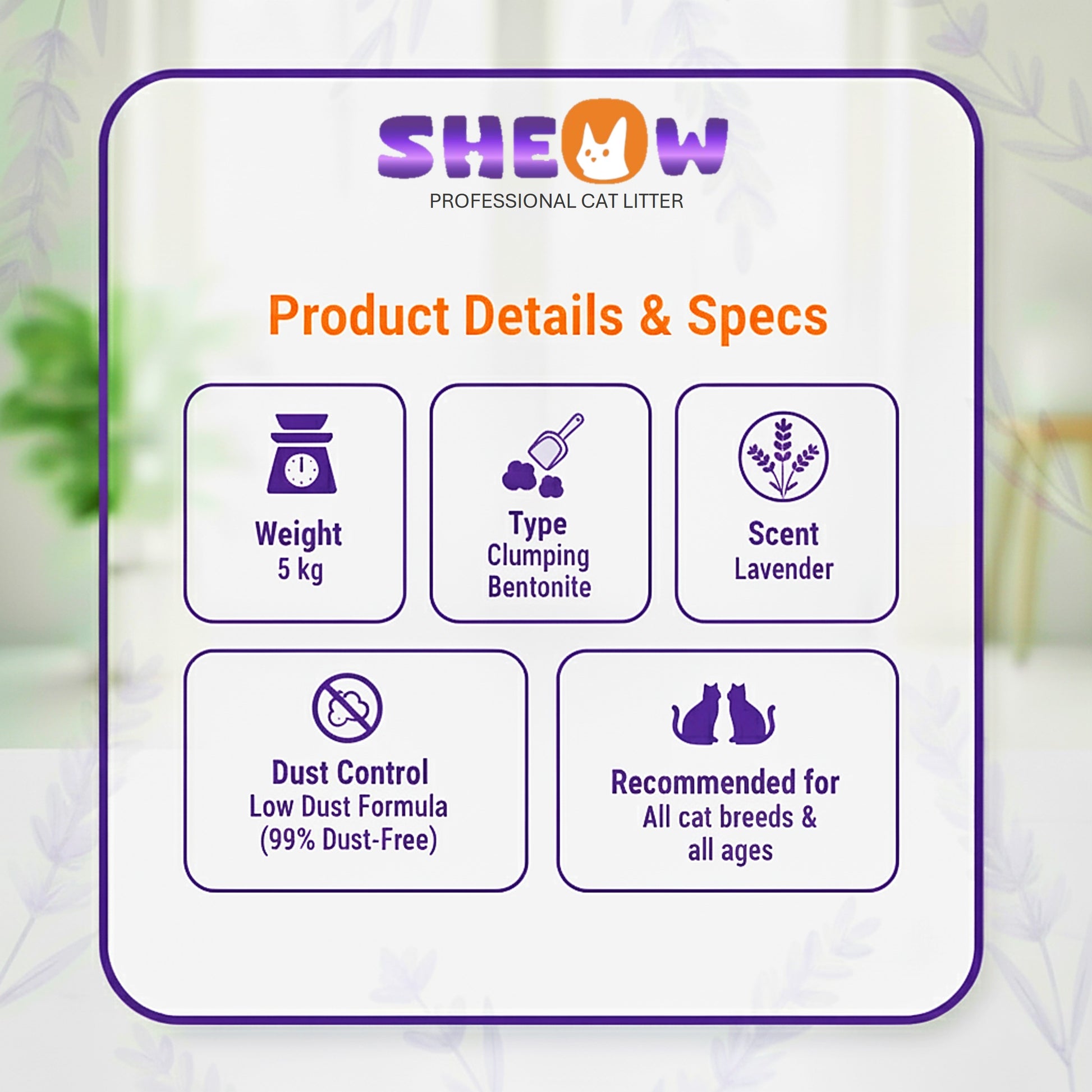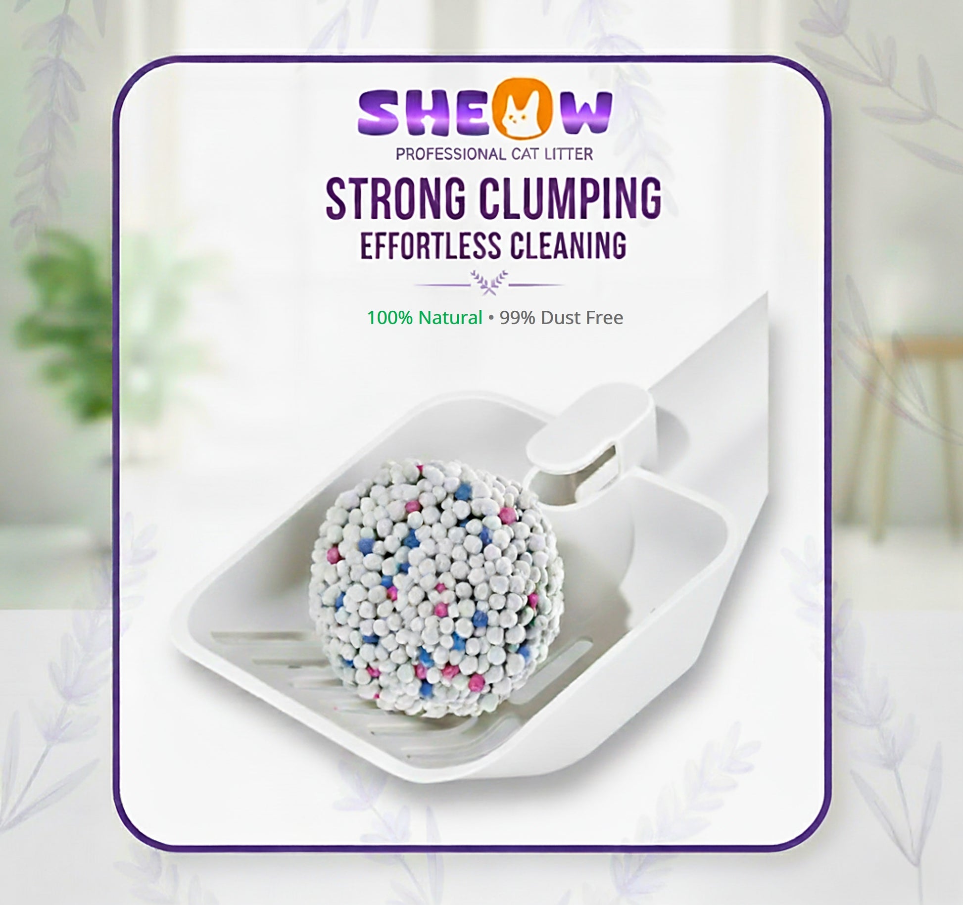 Sheow Cat Litter is crafted with premium sodium bentonite and a calming lavender fragrance to ensure superior performance every day. Designed for multi-cat households, it delivers long-term freshness, strong clumping, and reliable odor control you can trust.